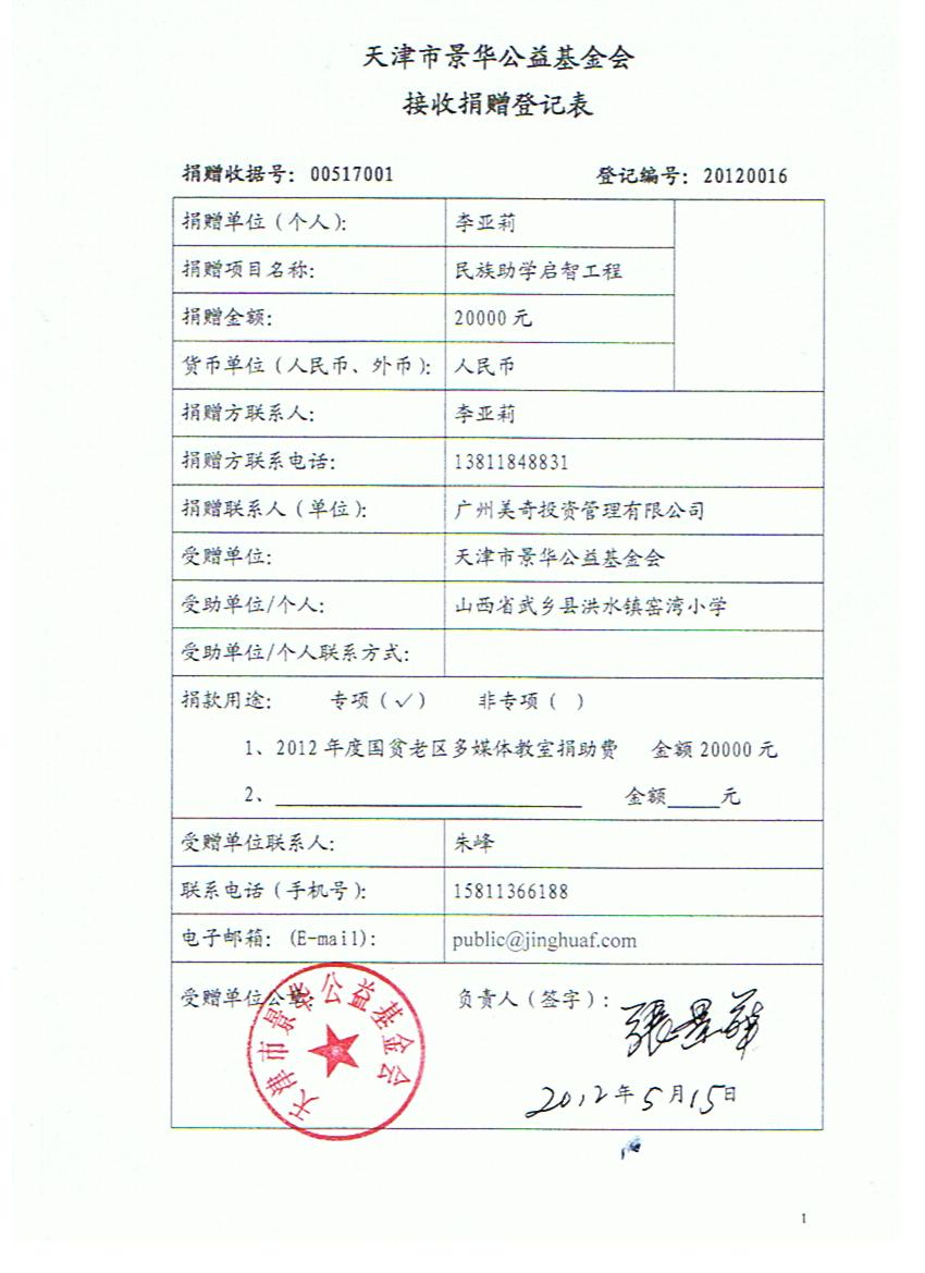 广州美奇投资管理有限公司总经理李亚莉给国贫老区窑湾小学多媒体教室捐助费20000元