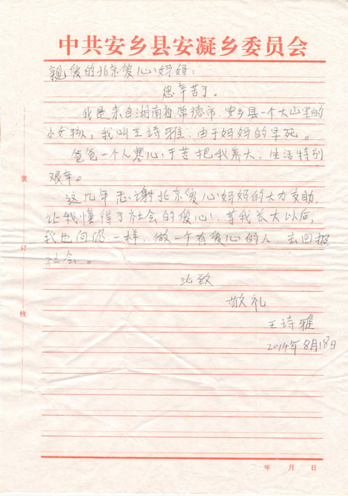 湖南省常德市安乡县城北小学第二分校王诗雅同学的感谢信 - 天津市景华公益基金网