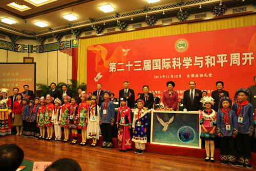 孩子们在第二十三届国际科学与和平周开幕式上和国家领导人在一起