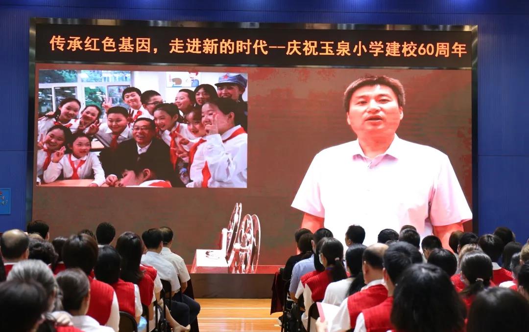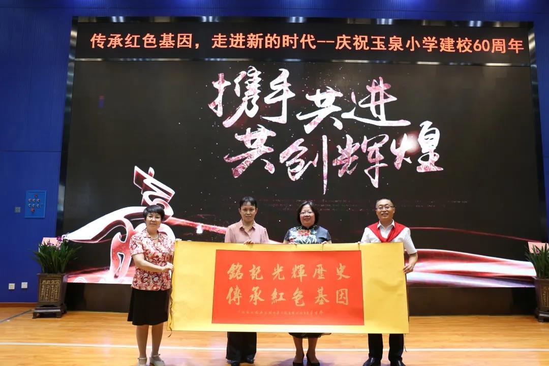 玉泉的60年发轫于部队,温润于红色基因,电视剧《亮剑》主人公原型王近山将军之女王媛媛老师亲临玉泉,送来了一颗红色的种子,讲述了骁勇善战的王近山将军在战场保家卫国的故事。全国红军小学建设工程理事会理事,景华公益基金会会长张景华向玉泉小学捐赠了《铭记光辉历史 传承红色基因》书法作品。