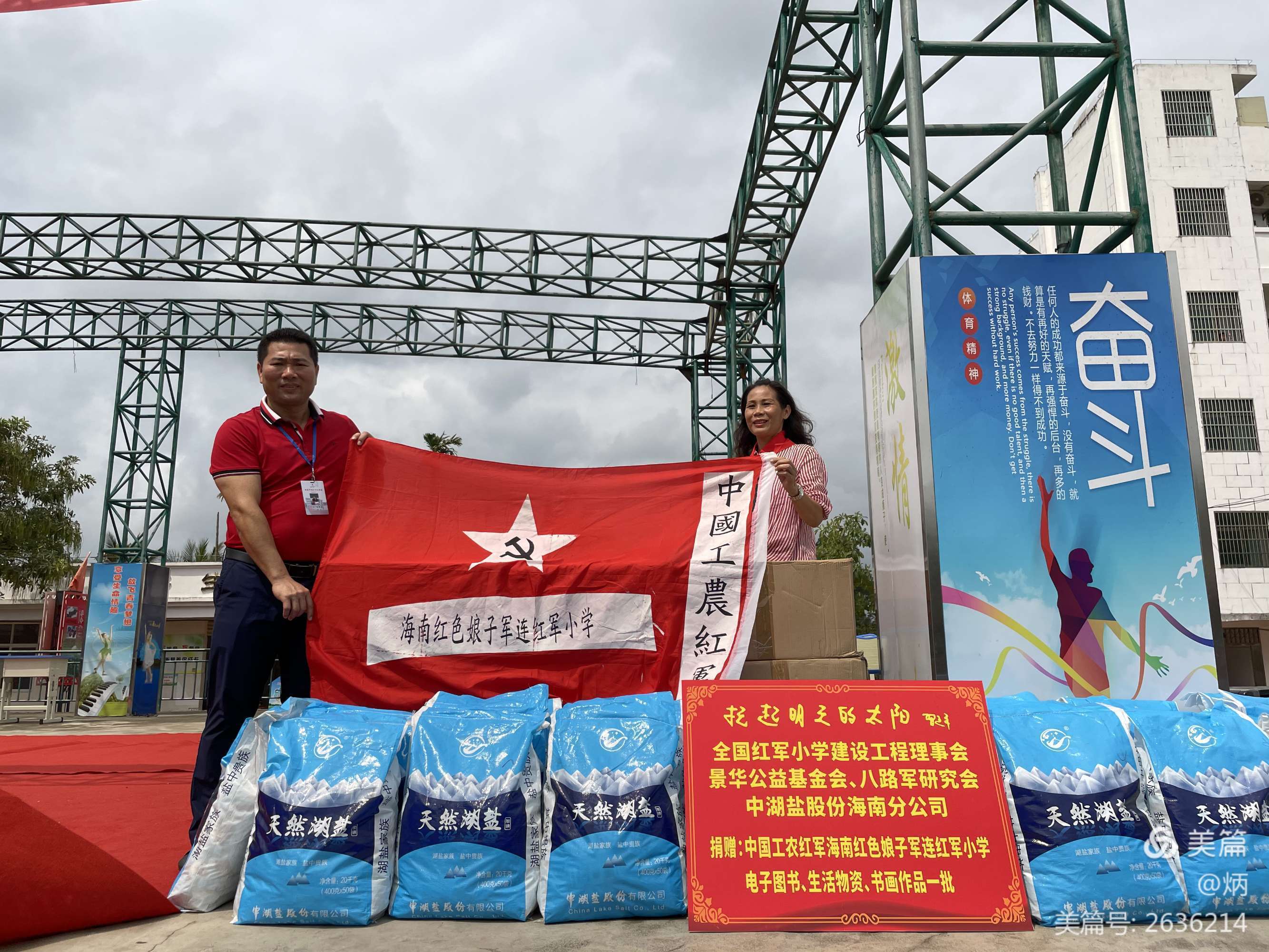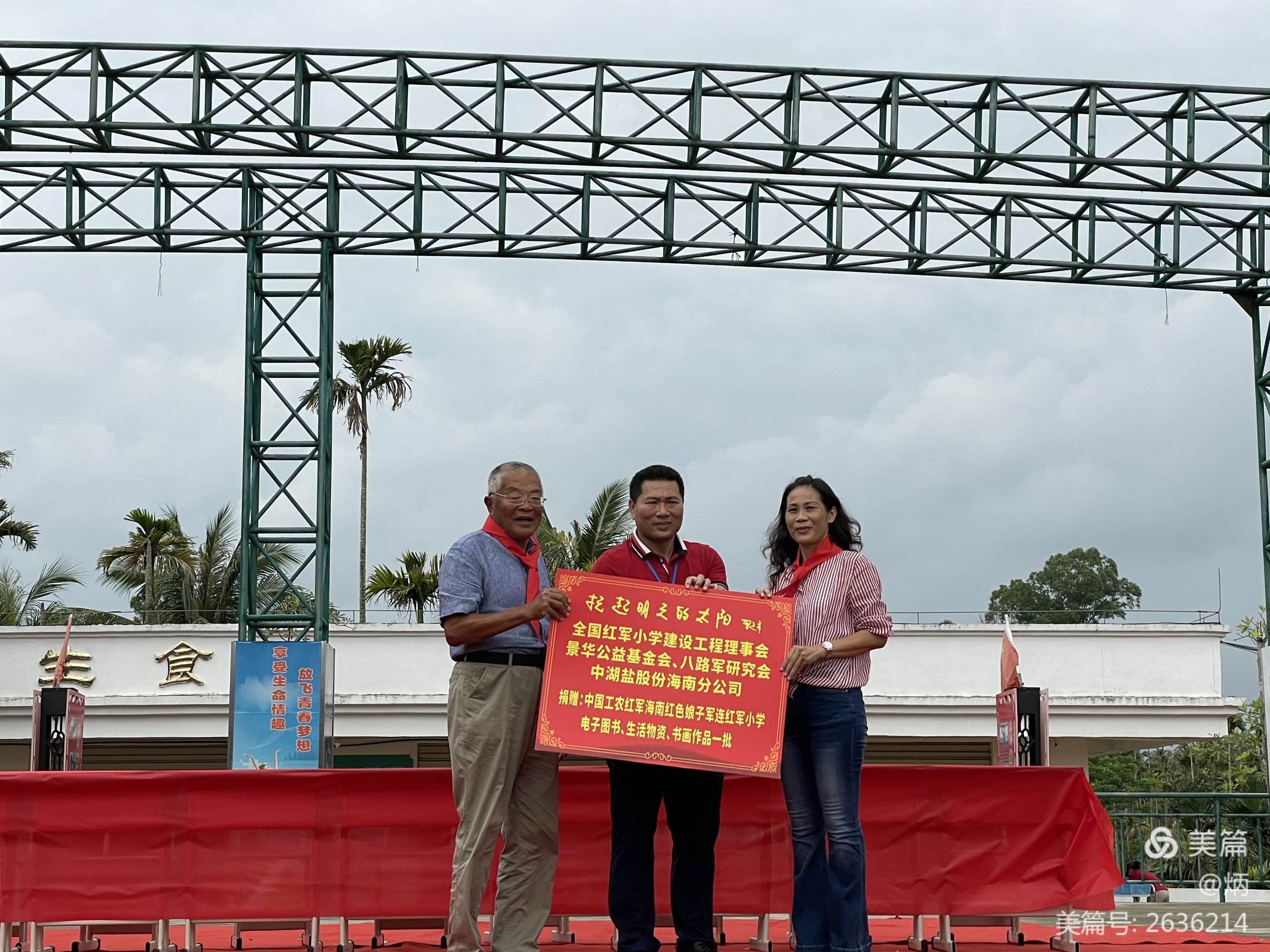 吕彤羽会长和中湖盐股份海南分公司总经理冯丽荣同志向红色娘子军连红军小学捐赠了电子图书和学生生活物资。