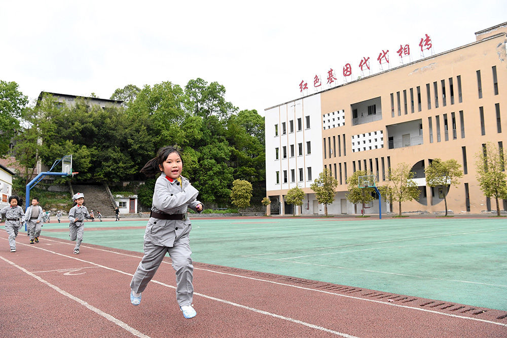 3月27日,中国工农红军重庆綦江王良红军小学学生在操场上跑步。新华社记者 唐奕